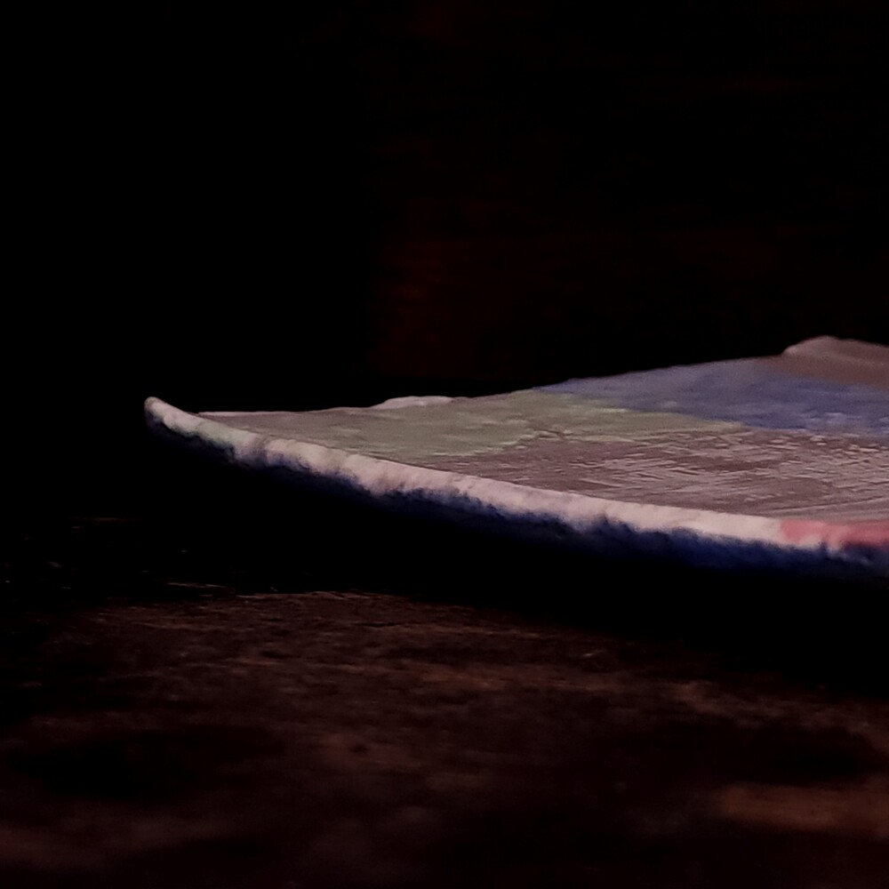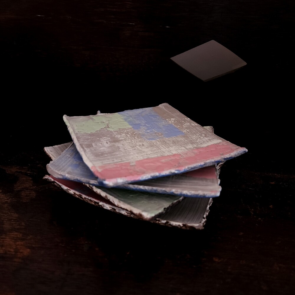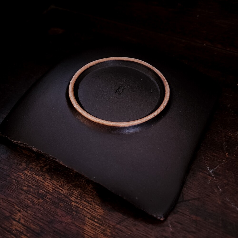 거친 표면을 가진 접시(A, B)의 뒷 면은 매트한 질감의 검은색이고, 네 귀퉁이가 살짝 위로 휘어있습니다.