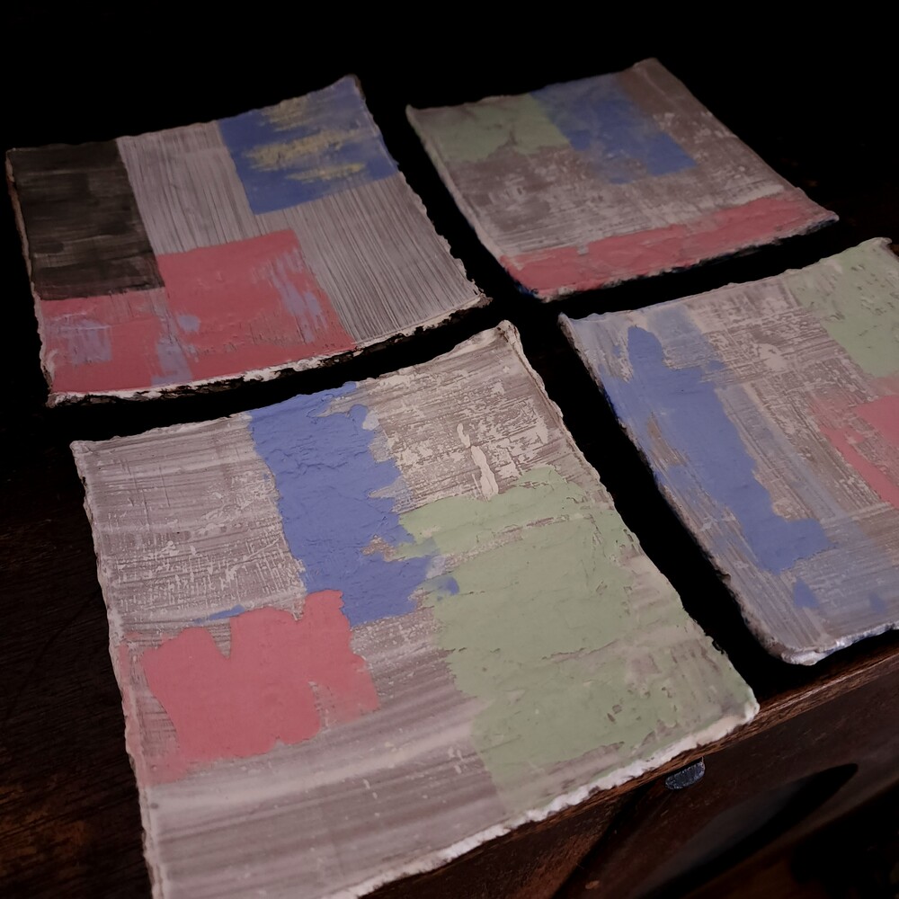 총 네 점의 접시 중 두 점 (A, B)은 표면이 사각사각 약간의 거친 질감이고,