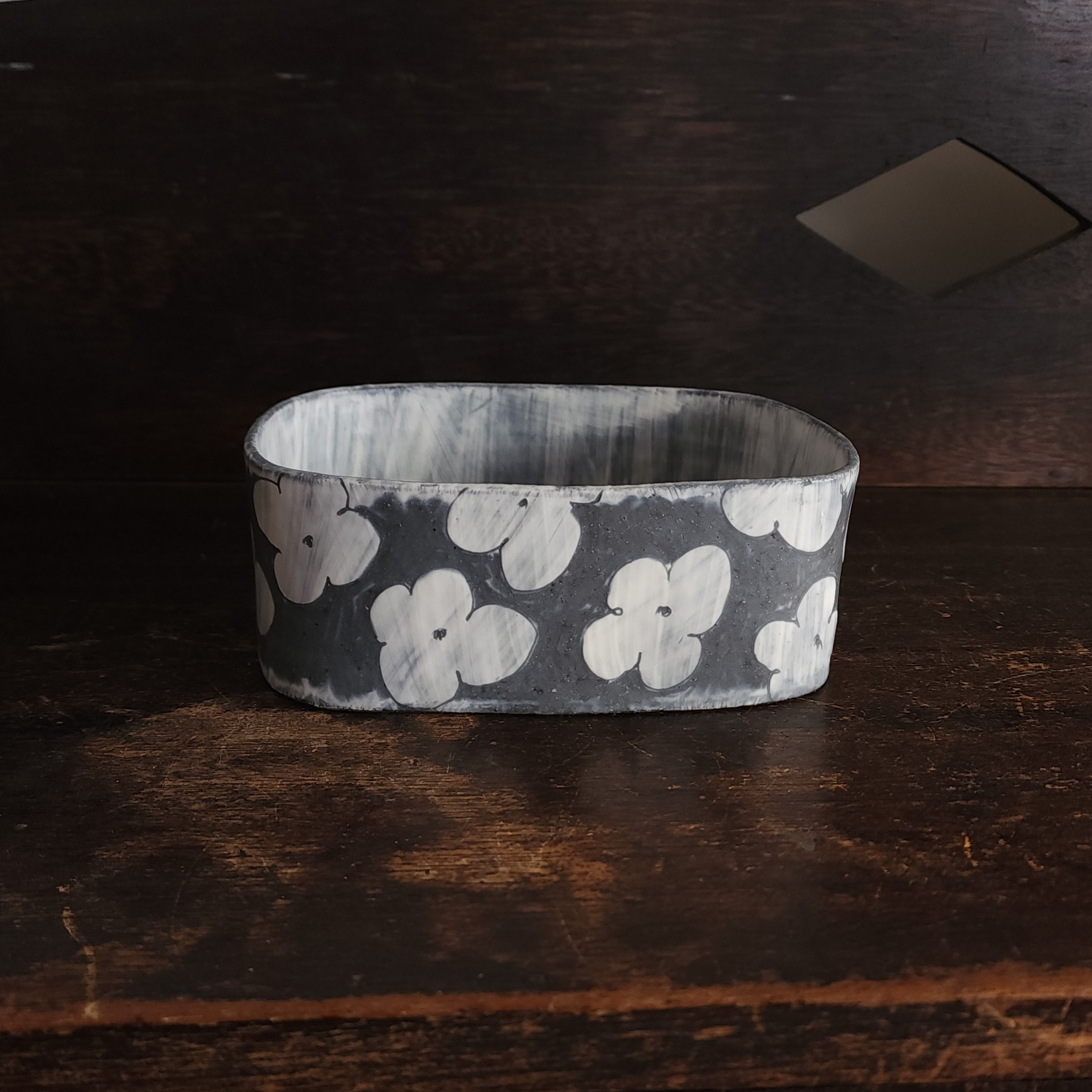 검정의 흙 바탕에 흰 흙으로 채우고, 긁어내고, 칠하는 방법으로 추상적인 마음을 표현하고 있습니다.